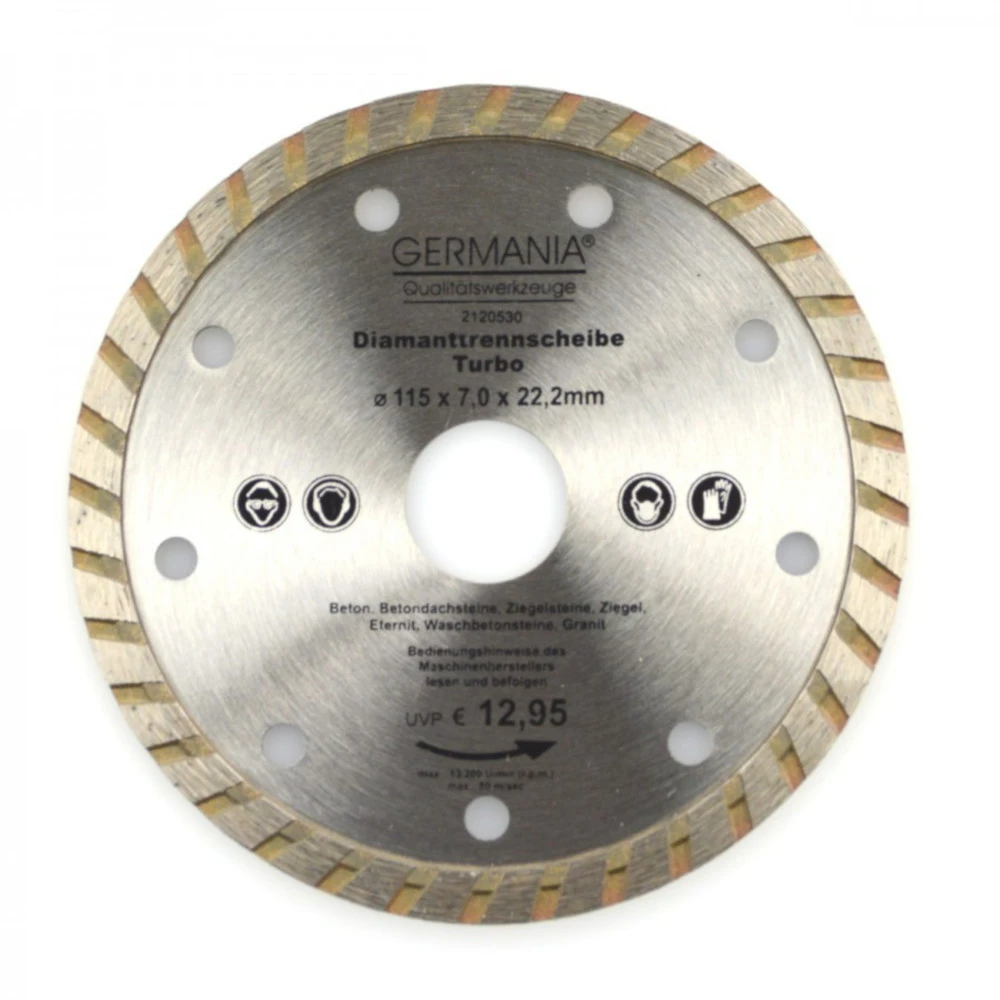 Die ungewöhnliche Härte und besondere Schnittfreudigkeit begeistert Profis und Hobby-Handwerker gleichermaßen. Hergestellt wird die Diamant-Trennscheibe aus zwei Teilen. Zum einen besitzt sie einen innen liegenden Körper aus Metall. Auf diesen wird die Schneidefläche aufgesetzt. Dieses besondere Segment ist mit Industriediamanten versetzt, welche der Trennscheibe zu ihrer Härte und Schnittfestigkeit verhelfen. Die eingesetzten Diamanten werden industriell hergestellt da Naturdiamanten zu brüchig und spröde sind. Mit dieser Turbo Trennscheibe können Sie an Beton (alt, armiert), Betondachstein, Ziegelstein, Ziegel, Eternit, Granit, Marmor und Waschbetonstein arbeiten. Die Diamanttrennscheibe eignet sich für harte Werkstoffe.