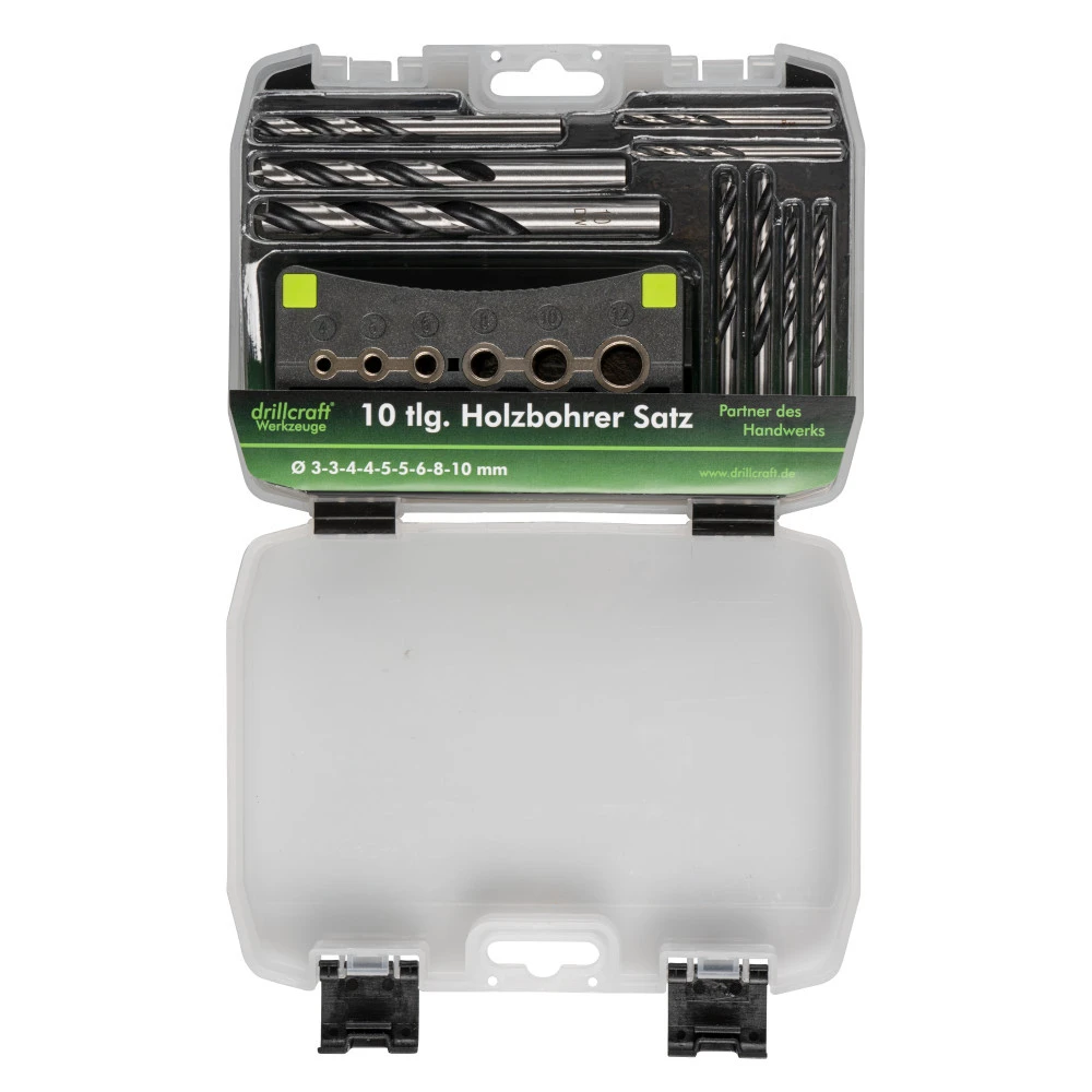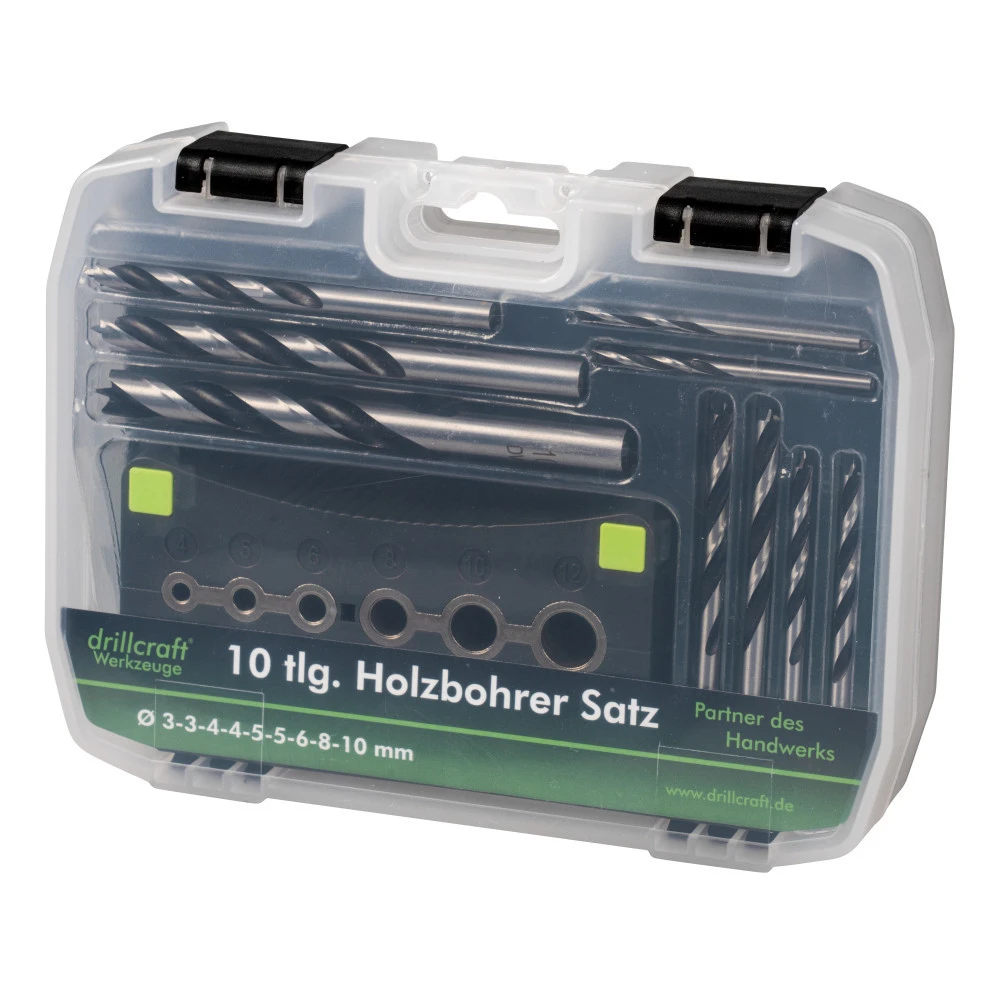 Holzbohrersatz 10-teilig, 2-10 mm, mit Bohrhilfe